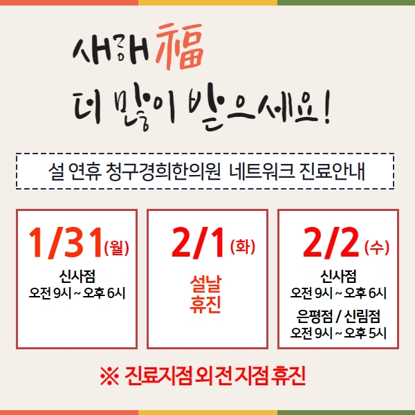전 지점 설연휴 진료 안내 드립니다. 위의 진료안내 이미지를 확인해주시고,