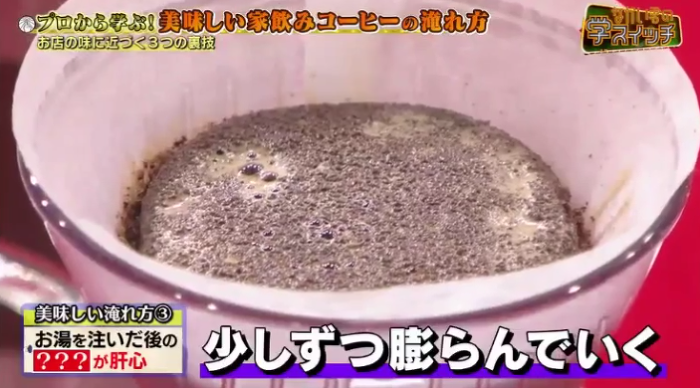 부풀어 오른상태로 바로 물을 부으면 가스가 온수와 커피가루의 접촉을 방해함