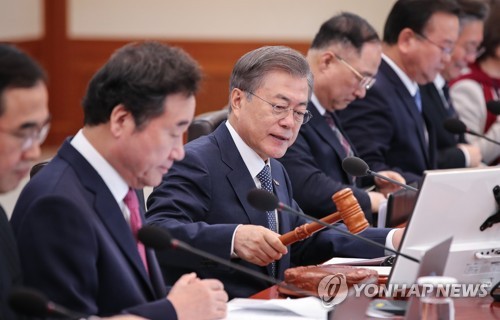 문 대통령, '국무회의 시작합니다'(서울=연합뉴스) 황광모 기자 = 문재인 대통령이 19일 오전 청와대에서 열린 국무회의에서 의사봉을 두드리며 시작을 알리고 있다.