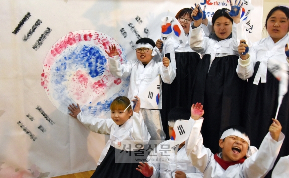 “임시정부 수립 100주년 만세” - 유관순 열사를 떠올리게 하는 흰 저고리에 검정 치마 등의 차림을 한 아이들이 17일 태극기를 든 채 자신의 손도장을 찍어 만든 대형 태극기 앞에서 만세를 외치고 있다. 서울 중구 사랑의 열매 회관에서 열린 이날 행사는 패션업체 형지엘리트가 대한민국 임시정부 수립 100주년을 기념해 개최했다. 이종원 선임기자 jongwon @ seoul . co . kr